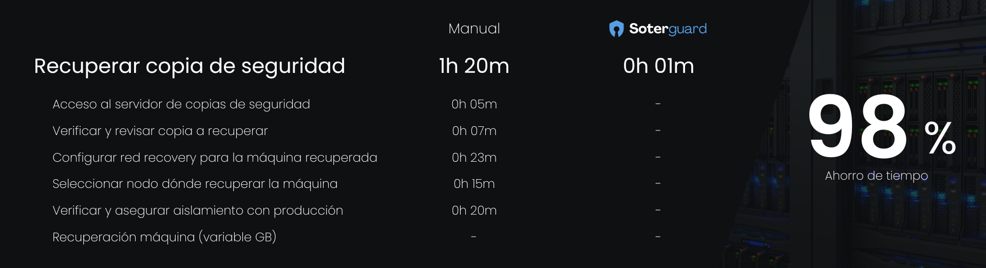 Soterguard automatiza el proceso de clonación de máquinas virtuales. Aun que sigue habiendo dependencia del tamaño de la máquina a clonar, las configuraciones y protocolos para garantizar la seguridad de la nueva máquina se realizan automáticamente.